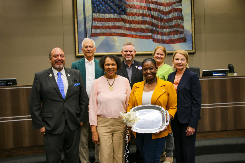 Bryan ISD Superintendent Ginger Carrabine and the Board of Trustees recognized Board Vice President Dr. Deidra Davis, whose term will end next month. Her fellow Team of 8 members presented Dr. Davis with an engraved platter thanking her for her three years of service on the school board.
